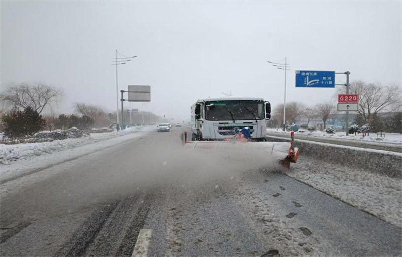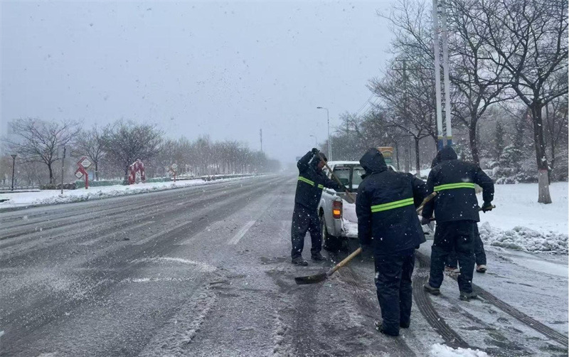 降雪后,按照“雪隨下隨清”的原則,待命隊員迅速行動,在包保路段通過滾刷鏟雪、撒布融雪劑、人工清掃等方式循環作業,高效開展除雪工作。